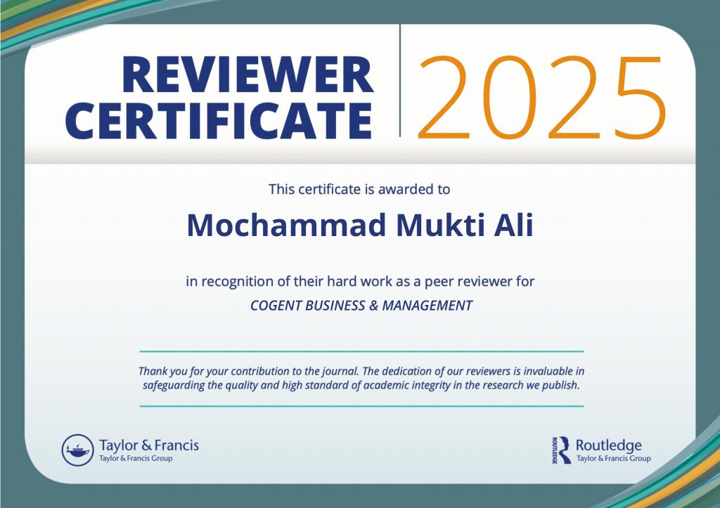 Reviewer Journal of Cogent Management & BusinessDr. Mochammad Mukti Ali, S.T., M.M.14 Agustus 2025Reviewer Previous Pos Reviewer Journal of Infrastructure, Policy, and Development (JIPD) Next Pos Reviewer Journal of Advances in Decision Sciences (ADS)