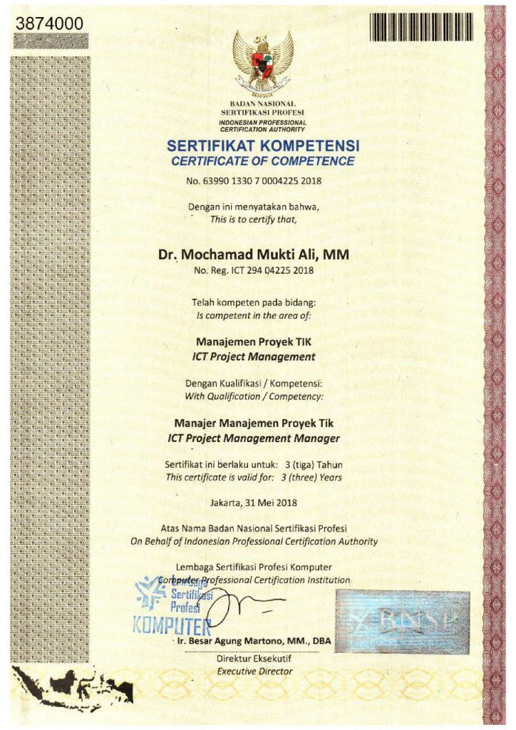 Sertifikat Kompetensi ICT Project ManagementDr. Mochammad Mukti Ali, S.T., M.M.15 Agustus 2025Sertifikat Nasional Previous Pos Sertifikat Kompetensi Supply Chain Analyst (SCA) Next Pos Sertifikat Kompetensi Manajemen Sumber Daya Manusia