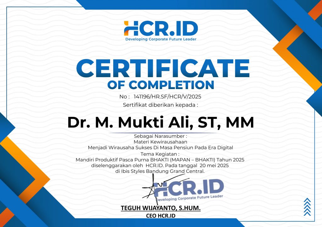 Menjadi Wirausaha Sukses di Masa Pensiun pada Era DigitalDr. Mochammad Mukti Ali, S.T., M.M.19 Agustus 2025Narasumber Previous Pos Menjadi Wirausaha Sukses di Era Digital Next Pos Pelatihan Persiapan Purna Karya