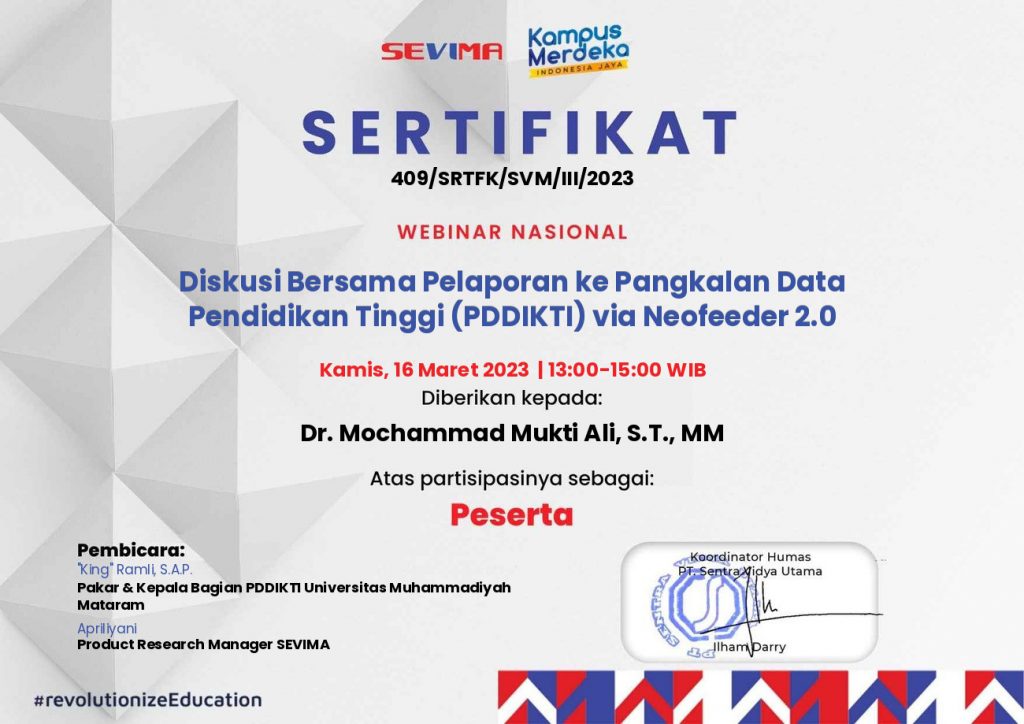 Pelaporan Data Pada PDDIKTI Neo Feeder 2.0Dr. Mochammad Mukti Ali, S.T., M.M.19 Agustus 2025Seminar Next Pos Strategi Sukses Mengamankan Data Sistem Akademik dan Website Kampus