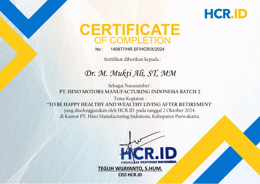 To Be Happy, Healthy, Wealthy Living After RetirementDr. Mochammad Mukti Ali, S.T., M.M.19 Agustus 2025Narasumber Previous Pos Program Penjenjangan Kepemimpinan Dasar BPJS Kesehatan Tahun 2024 Next Pos Praktisi Mengajar