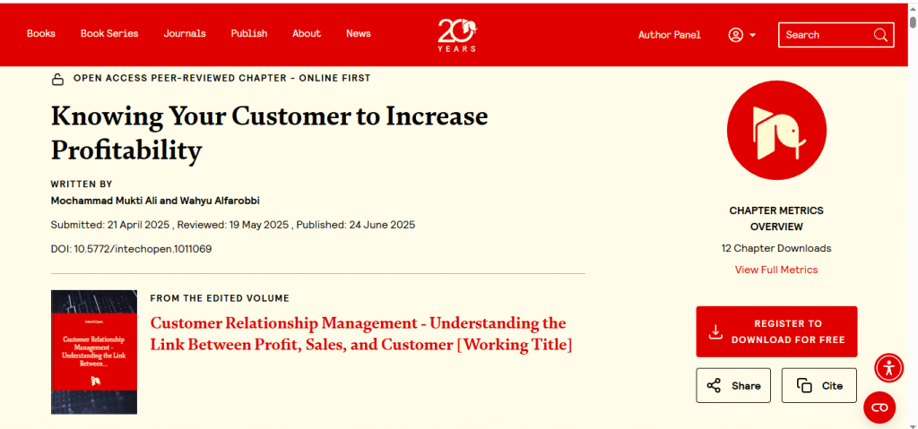 Book Chapter: Knowing Your Customer to Increase ProfitabilityDr. Mochammad Mukti Ali, S.T., M.M.25 Agustus 2025Buku Baca Buku, Klik Link di Bawah Ini: https://www.intechopen.com/online-first/1223030 Previous Pos Strategi Memenangkan Persaingan Bisnis Berbasis Perilaku Konsumen untuk Produk Fashion